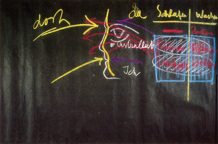 So you must say to yourself, through your physical organism you - as I said, always with the exception of the eyes - do not stop the sensory impressions. But you do not keep thoughts out either. And you can even imagine - it remains hypothetical for the time being for external observation - that even if there is a relative calm during the night for certain senses due to the social facilities, it is certainly not present for other senses; certainly not for the sense of warmth and cold, for example, and certainly not for the sense of touch either, because, isn't it true, when you press your thumb on the blackboard, you perceive the pressure. Why should the perception of pressure not be the case when you lay your back on the bed? You must of course perceive this pressure, which is conveyed by the sense of touch, throughout the night. Likewise, if you place something on your hand, you will feel it. Why shouldn't you be aware of the comforter you put on yourself throughout the night and so on? But not only that, but the continuation inwards, the formation of ideas and thoughts, why should we stop at them? Because they are mediated by the organism.