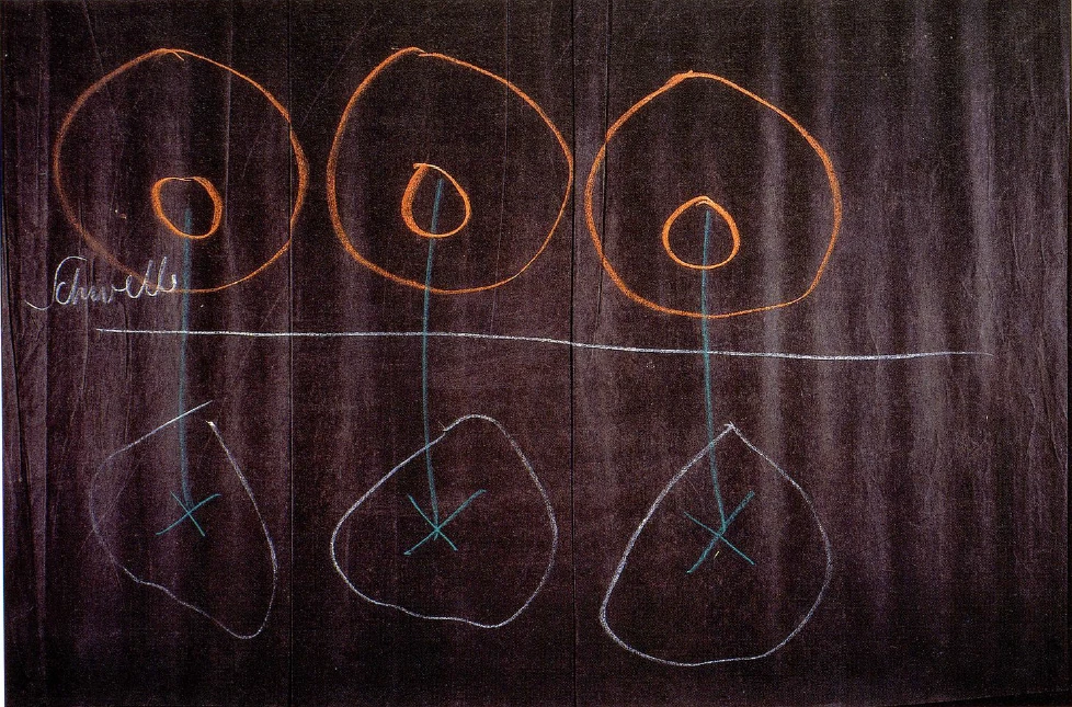 I said yesterday that when ascending from the physical plane into the higher worlds beyond the threshold, no abstractions exist, no abstract demands exist as posed in party programs. Instead, as soon as one has crossed the threshold, having passed the Guardian of the Threshold without lingering there as so many are inclined to do, one finds that only beings exist beyond the threshold. It is not possible to follow a program; one can only follow one or another being. One cannot group around an abstract idea, only around this or that being. While mankind is in great need of such knowledge, it is precisely this insight that men are vehemently rebelling against. At present, to gather under the umbrella of an abstract idea and to yearn for the realization of abstract programs is dear to people's hearts. To understand that abstract programs can only exist in the physical world and that something that can be grasped in abstract ideas can only be subject to the physical realm is something that people do not wish to comprehend, for it would be troublesome. I draw a line here, denoting the threshold (see drawing). Here are the party groups (blue circles) and here, their programs (X). This illustrates how people gather under party programs. Yet, since these programs correspond to certain beings in the supersensory world (orange), all those adhering to a party view link themselves with certain beings of the higher world. What is merely an image in the physical world corresponds to groupings around a being in the super-sensible world (red circles).