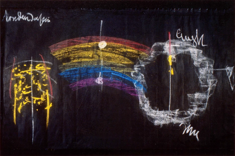 Now one went further, and one then said to oneself: Only the seraphim, cherubim, thrones have the power to produce something like this, to place something like this in the cosmos. Only this highest hierarchy has the ability to place something like this in the cosmos. But by placing something like this at the starting point of a world becoming, the development could continue. The sons of the seraphim, cherubim and thrones could, so to speak, carry on the development. - And this then happened in such a way that the entities of the second hierarchy, the Kyriotetes, Dynamis, Exusiai, brought forth by the Seraphim, Cherubim and Thrones, really did penetrate into this space, let us say, which had been saturnically formed here by Seraphim, Cherubim and Thrones, saturnically warmly formed. Then the younger, naturally cosmically younger beings entered. How did these cosmically younger entities work? While the Cherubim, Seraphim and Thrones manifested themselves in the element of warmth, the beings of the second hierarchy manifested themselves in the element of light. Here (on the drawing, red background) the Saturnian is dark, providing warmth. And within the dark, dark world of Saturnine existence arises that which can arise through the sons of the first Hierarchy, through the Exusiai, Dynamis, Kyriotetes.