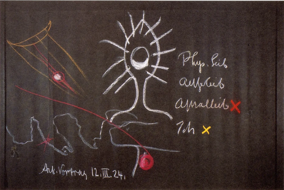 [ 23 ] The words used in the rituals of the Roman Catholic Church make no reference to what I have just told you. But at any celebration of High Mass you will see on the altar the Sanctissimum, the Monstrance containing the Sacred Host, and here (sketch on blackboard) rays are depicted. It is a representation of the Sun and the Moon. The very form of the Monstrance tells us that Christianity originates from a religious conception which, unlike that held by the Jews, recognises not only the influence of the Moon but also that of the Sun. Just as the influence working in the process of the birth of a human being is that of the Moon, so the influence working in Christ Jesus is that of the Sun.