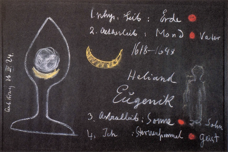 I have told you, gentlemen, that this knowledge, that the Christ is a being from the sun that lived in the man Jesus, is expressed by this sign, which can still be seen on the altar at every high mass: This is the Holy Sacrament, the monstrance (see drawing p. 128): the sun in the middle and the moon on which the sun is. As long as it was known that the Christ was a being from the sun, it made sense. For what is it that is inside the monstrance? It is caked flour. How could this caked flour come about? It could come about through the sun's rays falling on the earth, through the sun's light and warmth falling on the earth, through grain growing and flour being made from that grain. So that is a real product of the sun. It is really, if you want to put it that way, a body made of sunlight. As long as one knew that, the whole thing had a meaning.